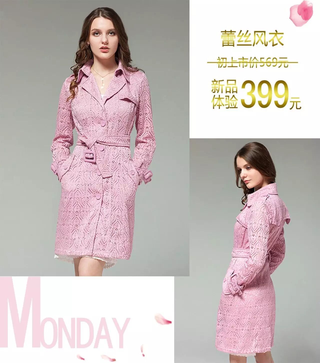 WEEKLY 天气逐渐变暖,亲爱的你是不是按捺不住要换上新装呢? 周一到周日,时时刻刻都要保持美丽。 自信工作,享受生活,才是女人的必修课。 从新衣开始,一起看看这周小贝献上的新意吧~ 初春时分,早晚还有些小凉意,你需要一件合适的“御寒”单品。 一件别致的蕾丝风衣就很不错,蕾丝的柔美和风衣的干练搭配,非常符合一周开始的气质哦!