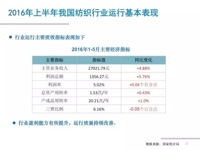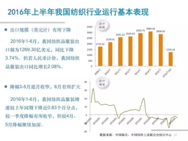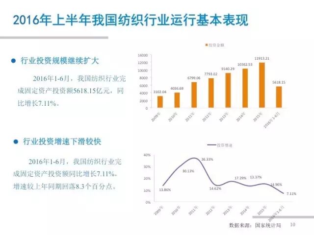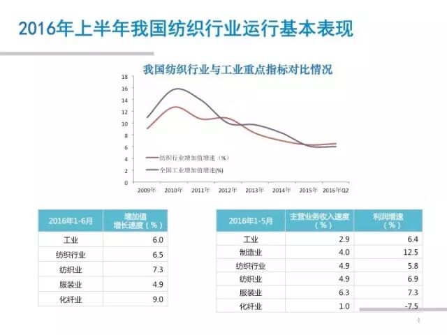 据中纺联产业经济研究院分析,2016年上半年,我国纺织行业面临的外部形势仍然严峻,企业成本负担并未减轻,内外市场增长动力偏弱,投资增速下滑明显。但纺织行业坚持加快推进转型升级,着力深化供给侧结构性改革,产销、效益等主要指标实现增长,行业运行基本平稳。
